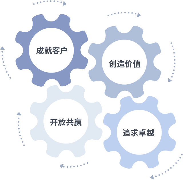 成就客户是一切决策的出发点,,,,创造价值是衡量所有工作的标准,,追求卓越是我们做事做人的态度,,,开放共赢是我们的格局也是最终的结果。。价值观的齿轮环环相扣,,推动着组织里的每个人不断向前。。。。